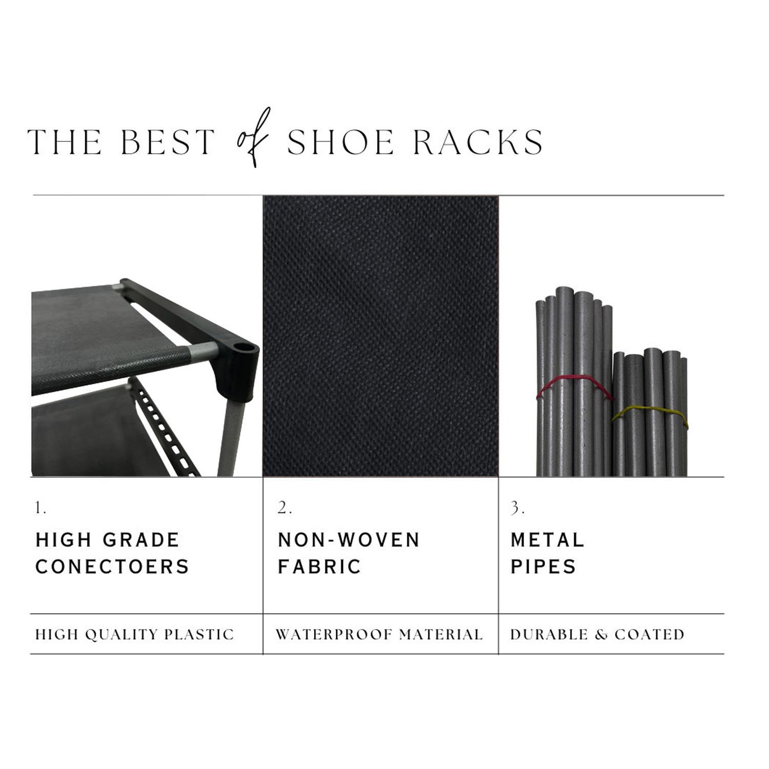 Beneath the stylish Black fabric cover lies a robust and highly sturdy metal pipe structure. Stability and structural integrity are paramount when it comes to furniture that holds multiple items. That is why the Urban Choice 12 tier shoe rack is constructed using heavy-duty, corrosion-resistant metal pipes that are designed to withstand daily wear and tear. These metal pipes are firmly connected by reinforced, thickened plastic connectors that ensure the entire shoe stand remains stable, even when fully loaded with heavy shoes or boots. You will not have to worry about wobbling or collapsing; this shoe rack is built to last for years, providing reliable support for all your footwear storage needs.