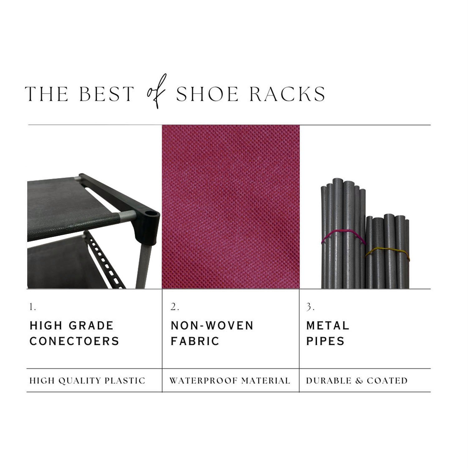 Beneath the stylish Black fabric cover lies a robust and highly sturdy metal pipe structure. Stability and structural integrity are paramount when it comes to furniture that holds multiple items. That is why the Urban Choice 4 tier shoe rack is constructed using heavy-duty, corrosion-resistant metal pipes that are designed to withstand daily wear and tear. These metal pipes are firmly connected by reinforced, thickened plastic connectors that ensure the entire shoe stand remains stable, even when fully loaded with heavy shoes or boots. You will not have to worry about wobbling or collapsing; this shoe rack is built to last for years, providing reliable support for all your footwear storage needs.