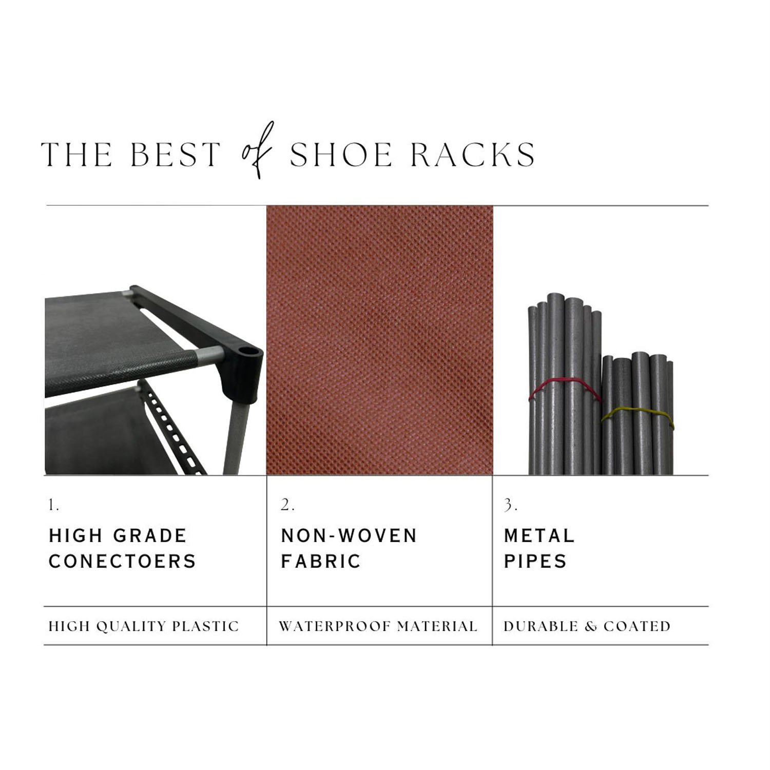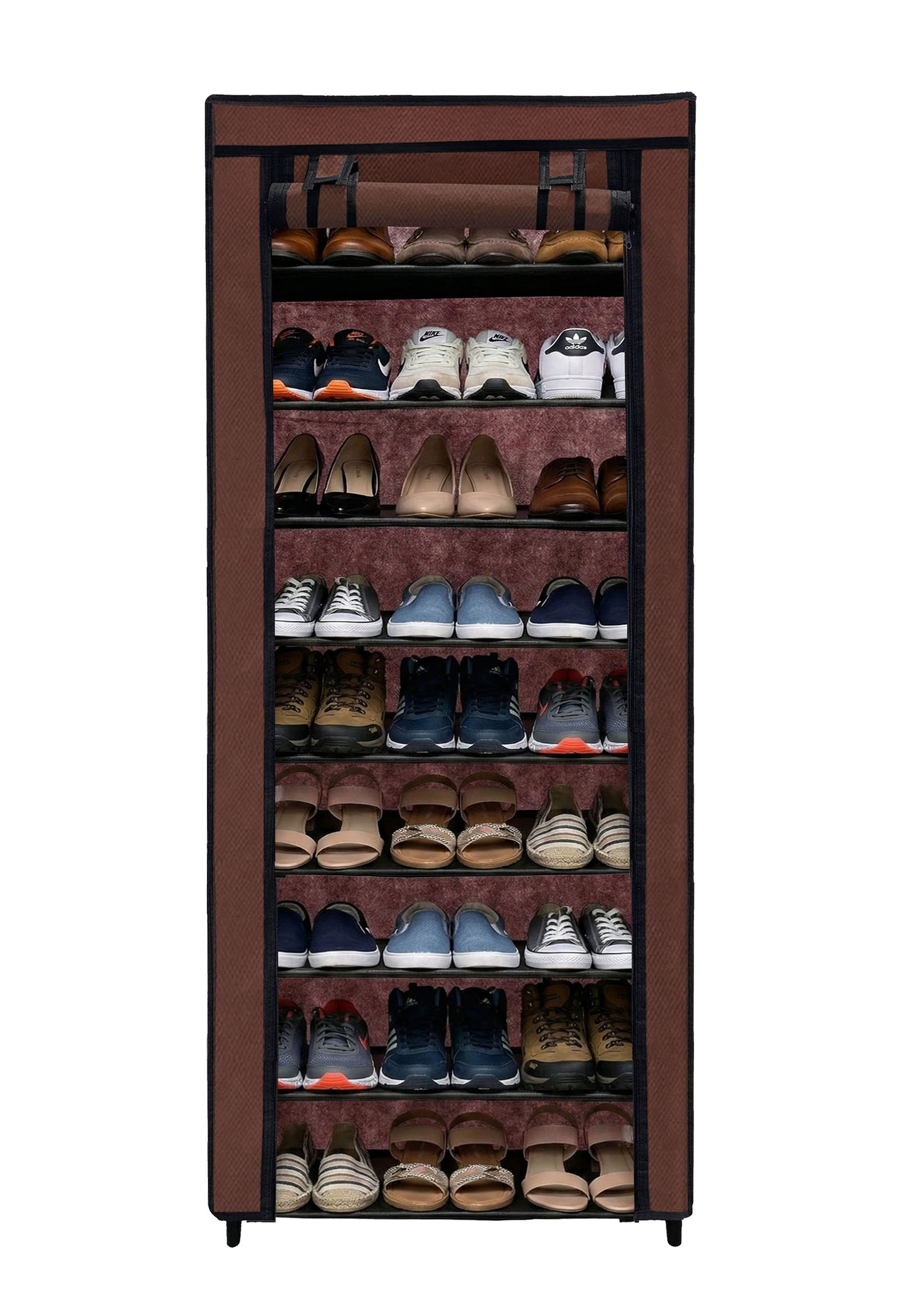 Beneath the stylish Brown fabric cover lies a robust and highly sturdy metal pipe structure. Stability and structural integrity are paramount when it comes to furniture that holds multiple items. That is why the Urban Choice 9 tier shoe rack is constructed using heavy-duty, corrosion-resistant metal pipes that are designed to withstand daily wear and tear. These metal pipes are firmly connected by reinforced, thickened plastic connectors that ensure the entire shoe stand remains stable, even when fully loaded with heavy shoes or boots. You will not have to worry about wobbling or collapsing; this shoe rack is built to last for years, providing reliable support for all your footwear storage needs.