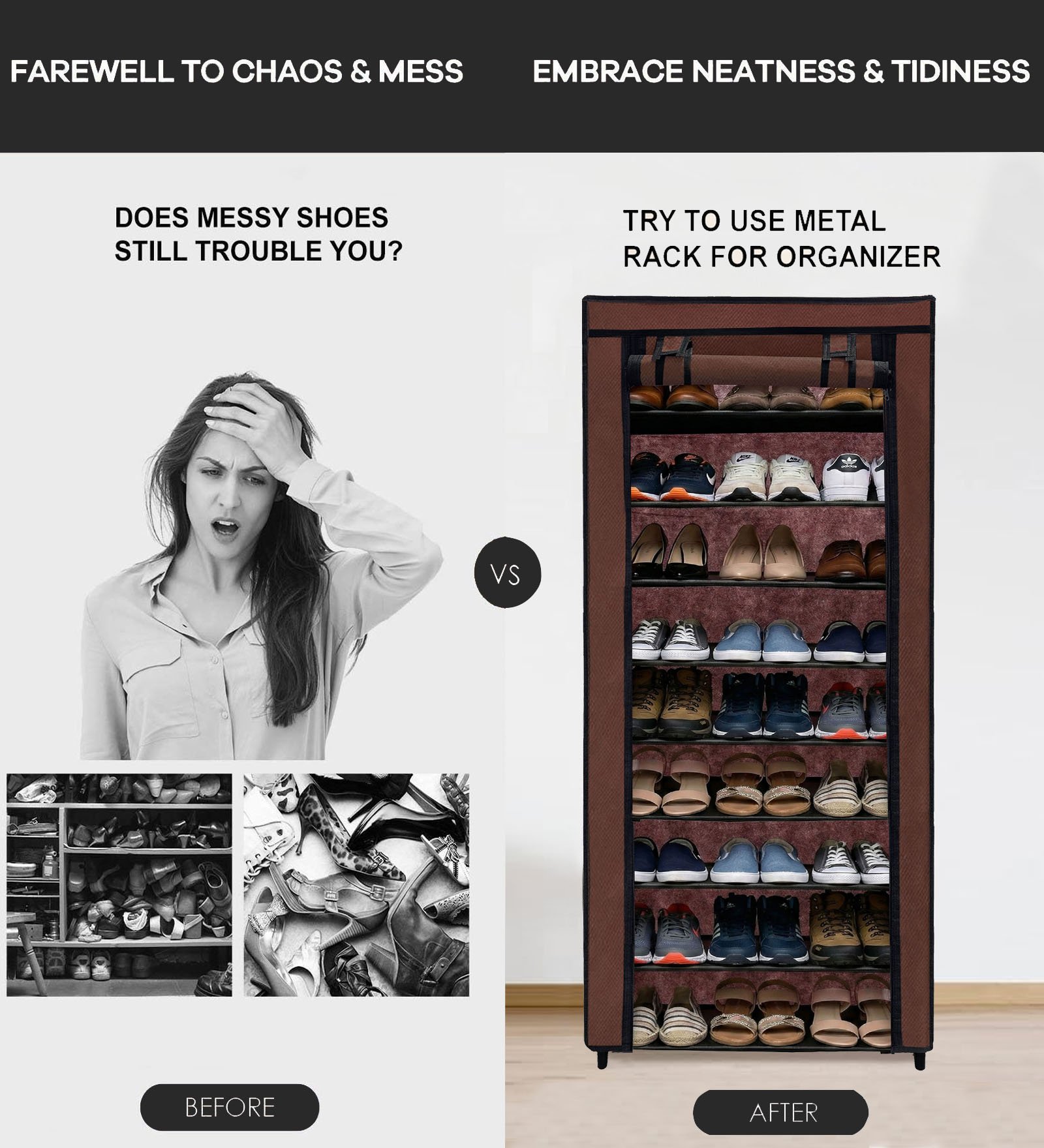 Elevate your home organization game today with the Urban Choice 9 Tier Shoe Rack. Experience the perfect combination of a sturdy metal frame, a protective dustproof cover, and a highly efficient space-saving design. Say goodbye to messy floors and hello to a clean, serene, and beautifully organized living environment. Make the smart choice for your home and enjoy the peace of mind that comes with knowing your footwear is stored safely, securely, and stylishly.”